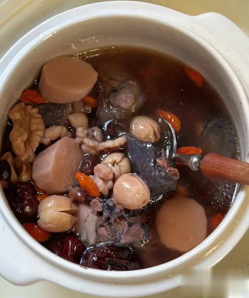 3. 倒入黑豆、核桃、红枣,转小火煲30分钟。