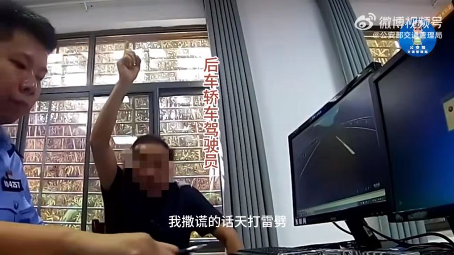 然而,曾某不仅认为自己无错,反而诬赖对方进入自己车道撞了自己,并称对自己说的话“百分之百负责”。面对交警出示的监控画面、对方行车记录仪画面等铁证,曾某依然嘴硬:
