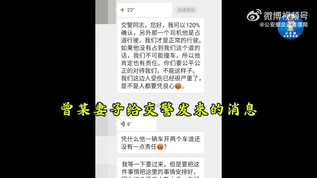 其妻子也给交警发来信息,同样将过错全都推给对方: