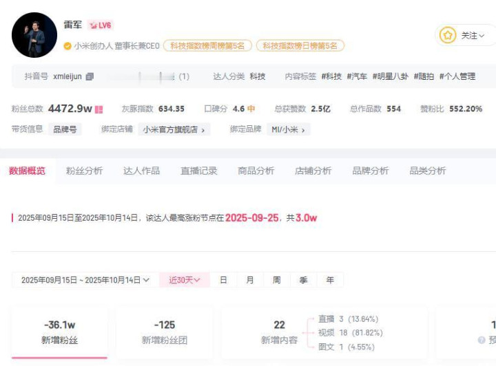 不久前,小米因“小字营销”翻车,雷军被质疑过度营销、人设崩塌,粉丝数量持续下滑。灰豚数据显示,9月15日至10月14日,雷军抖音账号近30日掉粉36.1万。从9月29日开始,雷军的抖音粉丝数量每天都在减少,最近15天减少了30.1万。10月14日,截至红星资本局发稿,雷军抖音粉丝数为4472.9万,两日内掉粉超6万。